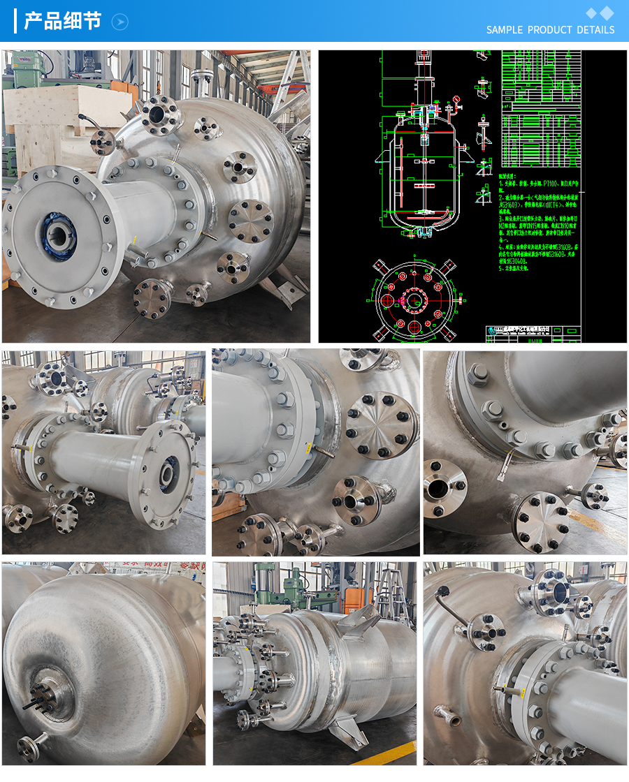 主要材料 釜體材料主要采用不銹鋼與碳鋼復合材質 S30408(304)+Q345R、S31603(316L) +Q345R、S32168(321)+Q345R, 也可是純不銹鋼材質,并可根據不同介質要求制作鈦材、鎳材、鋯材、哈氏合金、蒙耐爾合金等復合材質反應釜,也可根據客戶要求主要材料噴涂四氟PTFE/PPL。