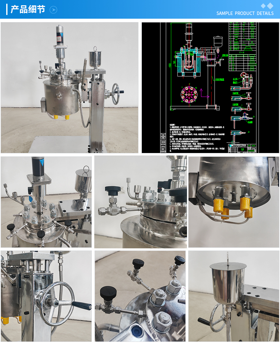 常規(guī)釜蓋開口 氣相口配針形閥,液相口配針形閥及釜內(nèi)插底管,固體加料口配絲堵,測控溫口配鉑電阻,壓力表安全爆破口配壓力表及安全防爆裝置,釜內(nèi)冷卻盤管進(jìn)、出口配水咀